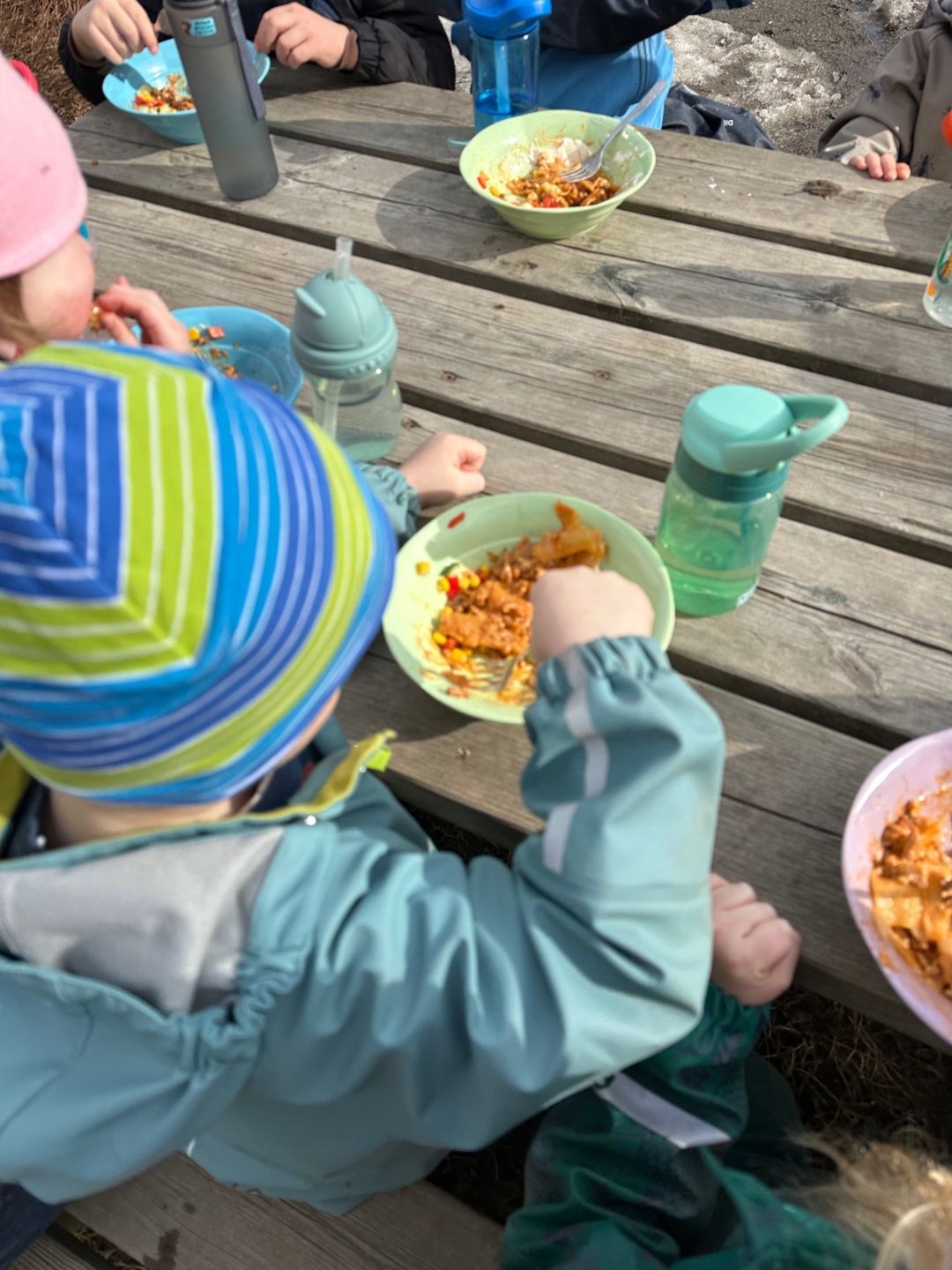 Tre dager i uka er det brød til lunsj. Barna får tidlig øve på å smøre sin egen mat. De kan velge mellom mange påleggsorter. To dager i uka serverer vi varm lunsj.