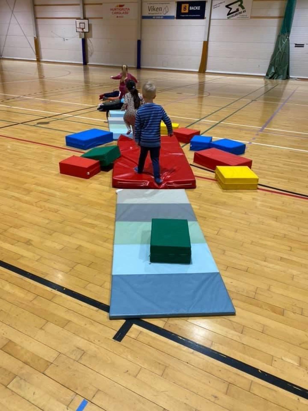 Vi har hinderløype, friidrett, fotball, håndball, sangleker, tradisjonelle barneleker, turn og dansing. Alle barna, uansett alder, er med ut i fra sine forutsetninger; 5-åringen spurter av sted mens 1-åringen småtripper over gulvet hånd i hånd med en trygg voksen.